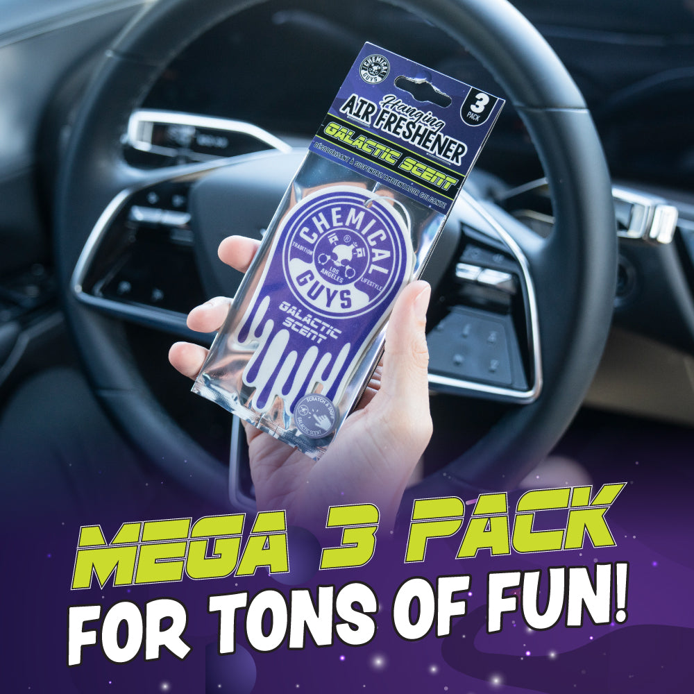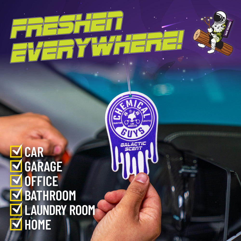 Blast off to new heights of scent satisfaction with Chemical Guys Galactic Scent Hanging Air Freshener. here to give your car. truck. or SUV a big bang of out-of-this-world freshness. This exhilaratingly crisp. woodsy scent is specially formulated to transport you to an exotic-smelling intergalactic oasis. far away from any bad smells you may encounter in your ride’s interior. Discover a whole new universe of freshness with Chemical Guys Galactic Scent Air Freshener.???