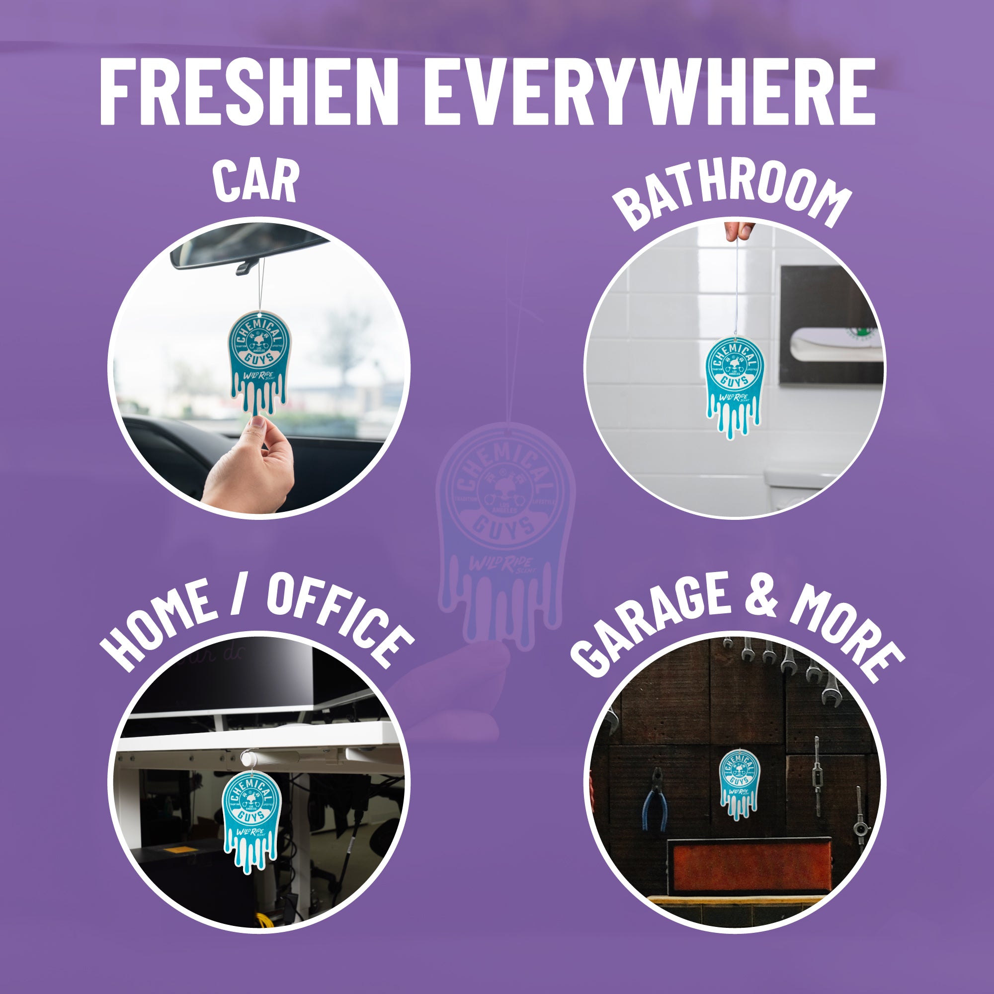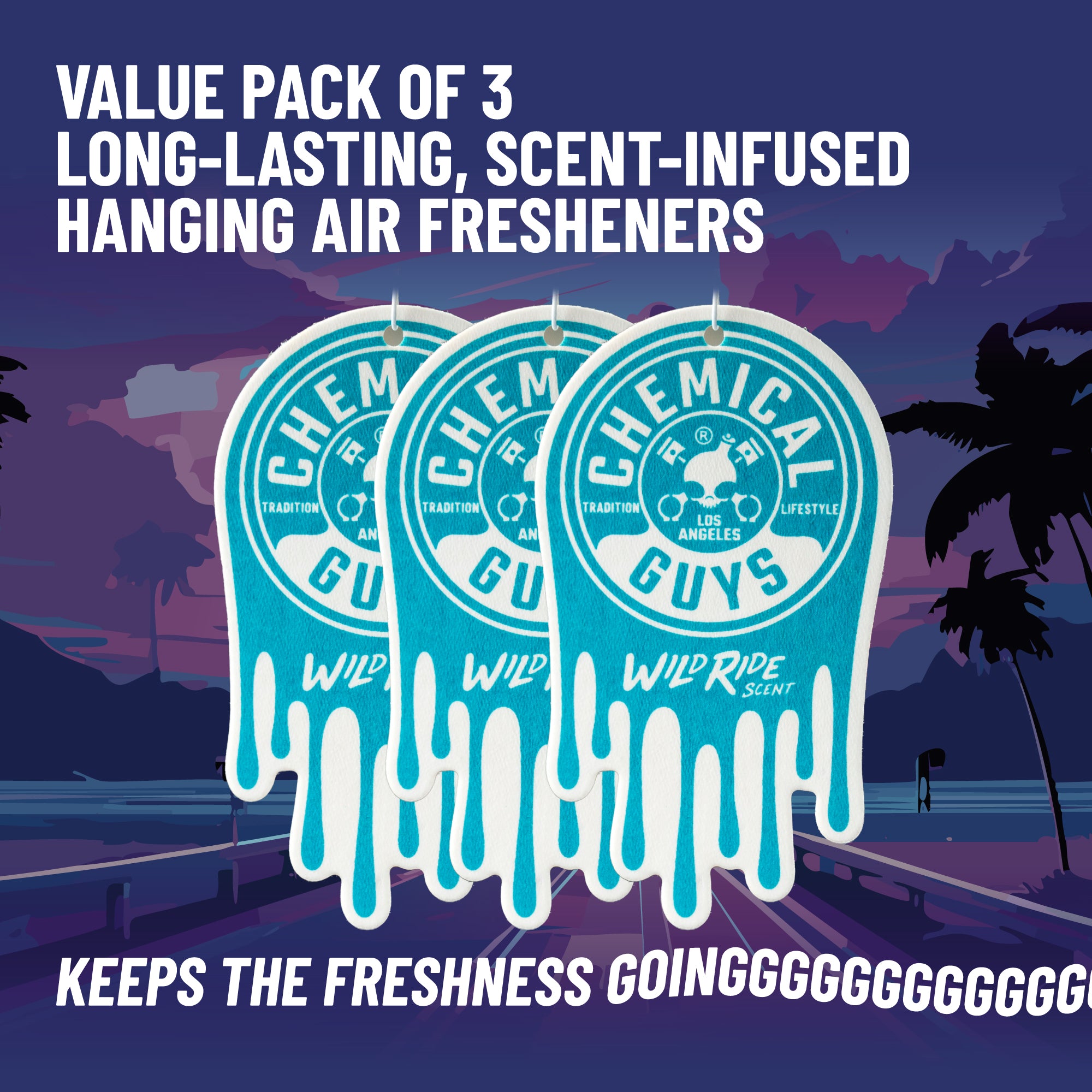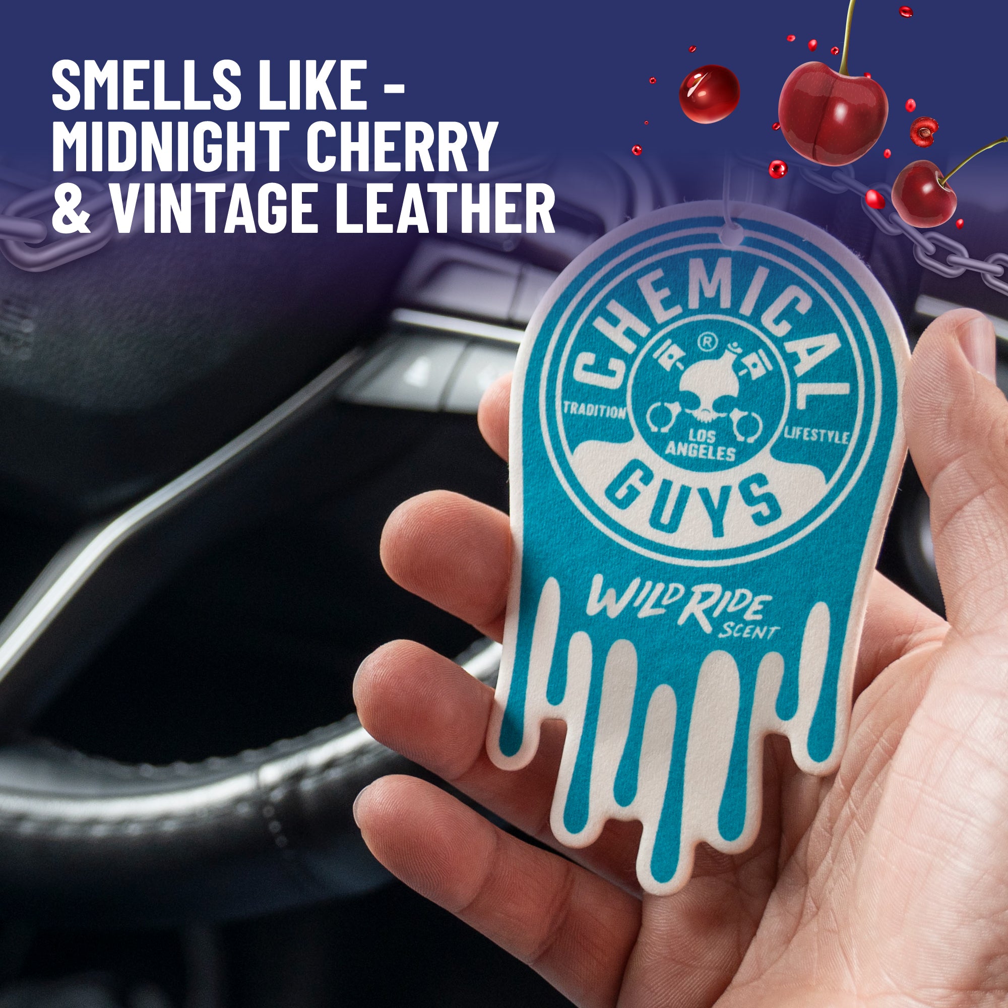 Chemical Guys Wild Ride Hanging Air Freshener is infused with a bold midnight cherry and vintage leather aroma that screams adrenaline and adventure; this exhilarating scent evokes the excitement of late-night escapades and adventure.?
